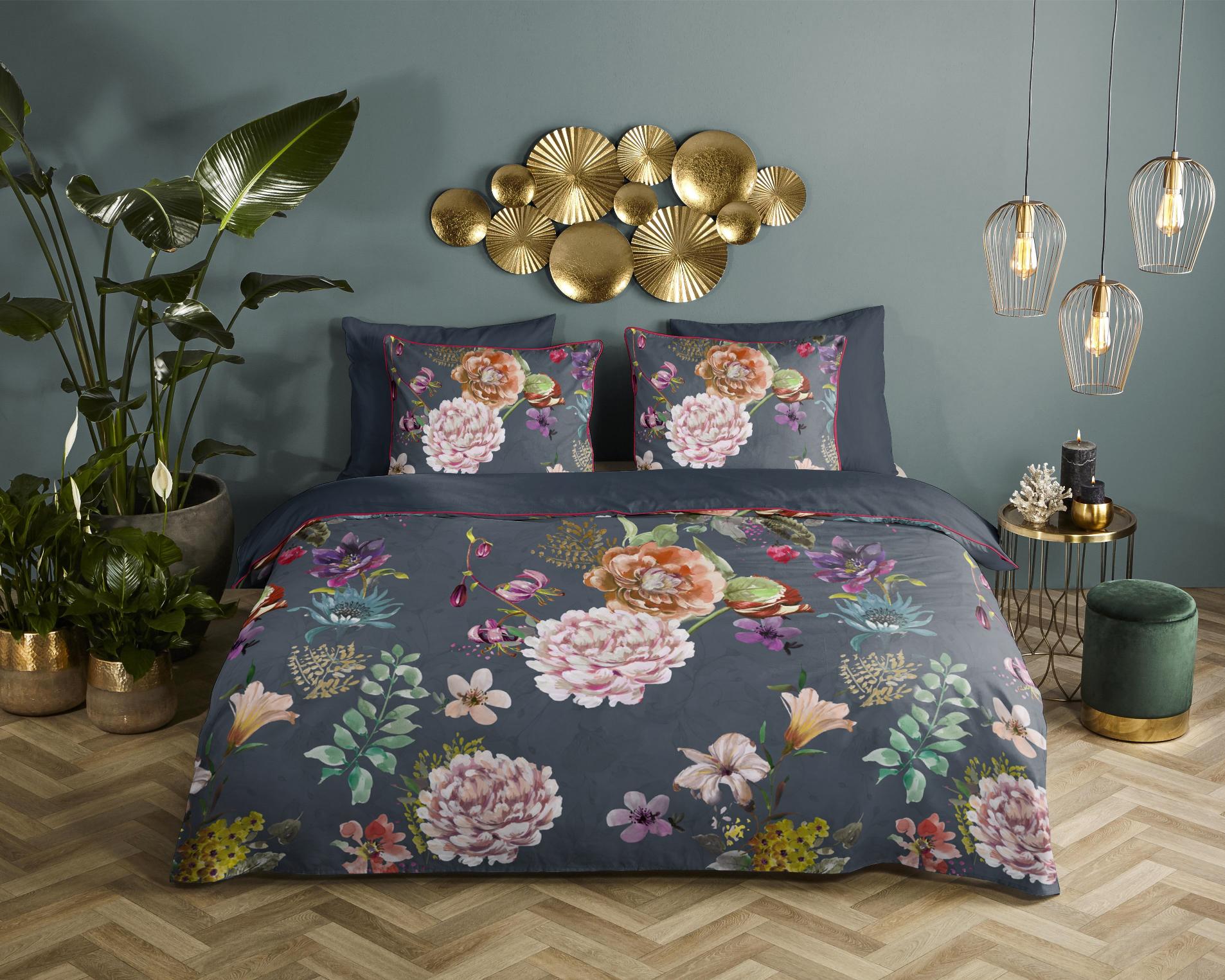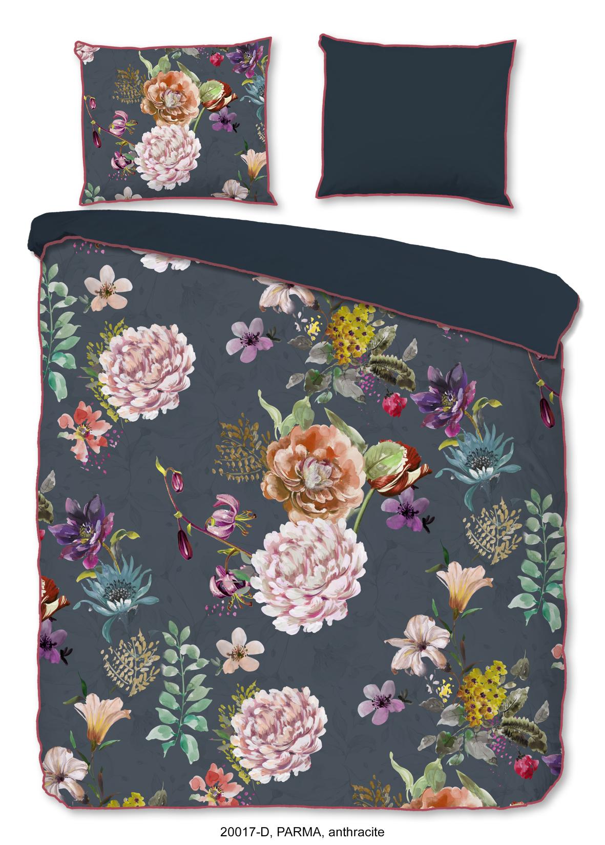 Satijnen dekbedovertrek Parma van Descanso. Dit dekbedovertrek met bloemen, in de kleur antraciet, is gemaakt van 100% katoen-satijn. Descanso dekbedovertrek is luxe, stijlvol en elegant. De achterkant heeft een bijpassende uni kleur. Het dekbedovertrek en de kussenslopen zijn afgewerkt met een luxe bies in een bijpassende kleur. Dat geeft een chique uitstraling aan je slaapkamer. Het dekbedovertrek van Descanso is gemaakt van 100% organisch katoen-satijn. Satijn is een speciale weeftechniek die zorgt voor een mooie glans en een zachte, soepele stof. Het is ademend, vocht- en warmteregulerend, en dus heerlijk comfortabel. Oeko-Tex gecertificeerd: vrij van schadelijke stoffen. Wasbaar op max. 60°C en geschikt voor de wasdroger.