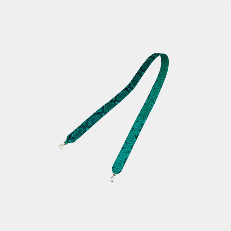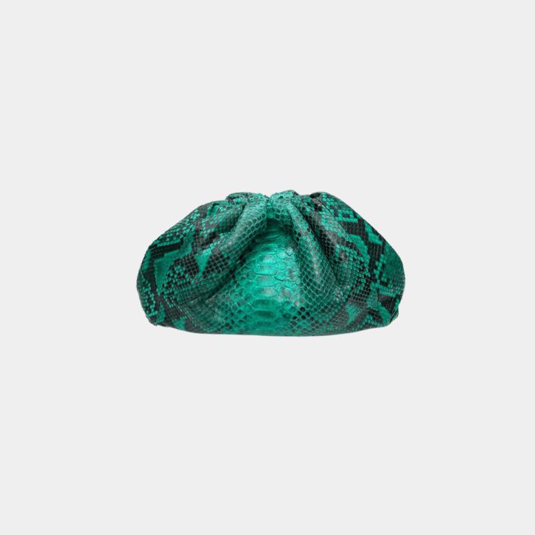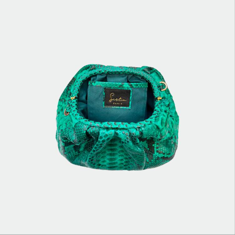 Pochette souple en python, avec doublure intérieure en coton et fermeture magnétique. Compartiment unique avec petite poche. Finitions métalliques. Bandoulière amovible en python.