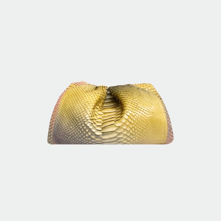Pochette souple en python, avec doublure intérieure en coton et fermeture magnétique. Compartiment unique avec petite poche. Finitions métalliques. Bandoulière amovible en python.
