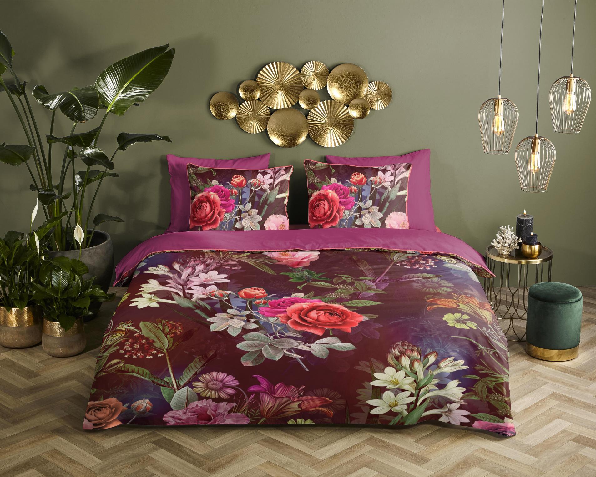 Housse de couette en satin Simone de Descanso. Cette housse de couette à fleurs, de couleur bordeaux, est fabriquée en 100% coton-satin. La housse de couette Descanso est luxueuse, élégante et stylée. Le dos a une couleur unie assortie. La housse de couette et les taies d'oreiller sont finies avec un passepoil luxueux dans une couleur assortie. Cela donne une allure chic à votre chambre. La housse de couette de Descanso est fabriquée en 100% coton-satin biologique. Le satin est une technique de tissage spéciale qui donne un bel éclat et un tissu doux et souple. Il est respirant, régule l'humidité et la chaleur, et donc très confortable. Certifié Oeko-Tex : exempt de substances nocives. Lavable à max. 60°C et adapté au sèche-linge.
