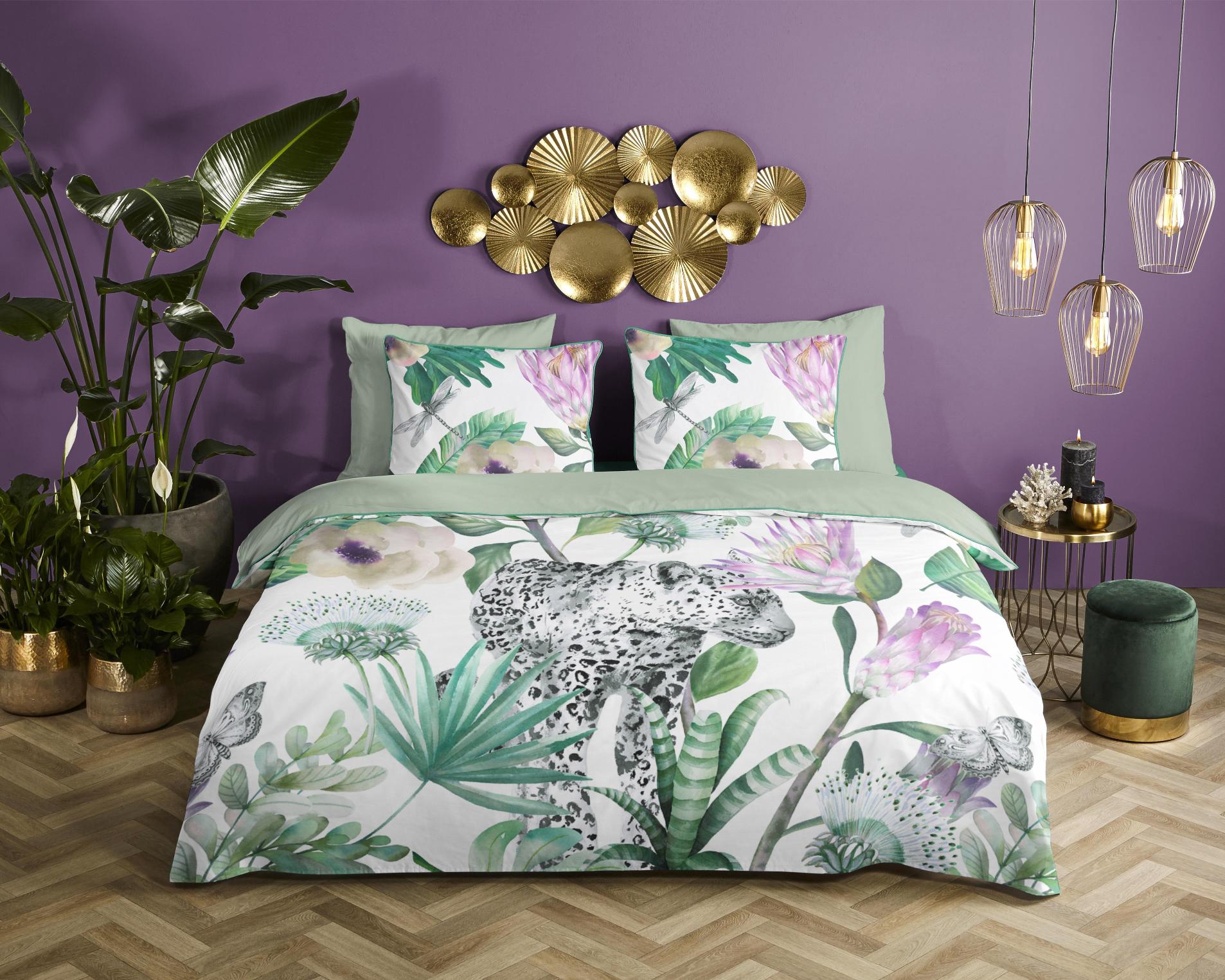 Housse de couette en satin Volterra de Descanso. Cette housse de couette avec des fleurs et un léopard, de couleur verte, est faite de 100% coton-satin. La housse de couette Descanso est luxueuse, élégante et stylée. Le dos a une couleur unie assortie. La housse de couette et les taies d'oreiller sont finies avec un passepoil luxueux dans une couleur assortie. Cela donne une allure chic à votre chambre. La housse de couette de Descanso est faite de 100% coton-satin biologique. Le satin est une technique de tissage spéciale qui donne un bel éclat et un tissu doux et souple. Il est respirant, régule l'humidité et la chaleur, et est donc très confortable. Certifié Oeko-Tex : exempt de substances nocives. Lavable à max. 60°C et adapté au sèche-linge.