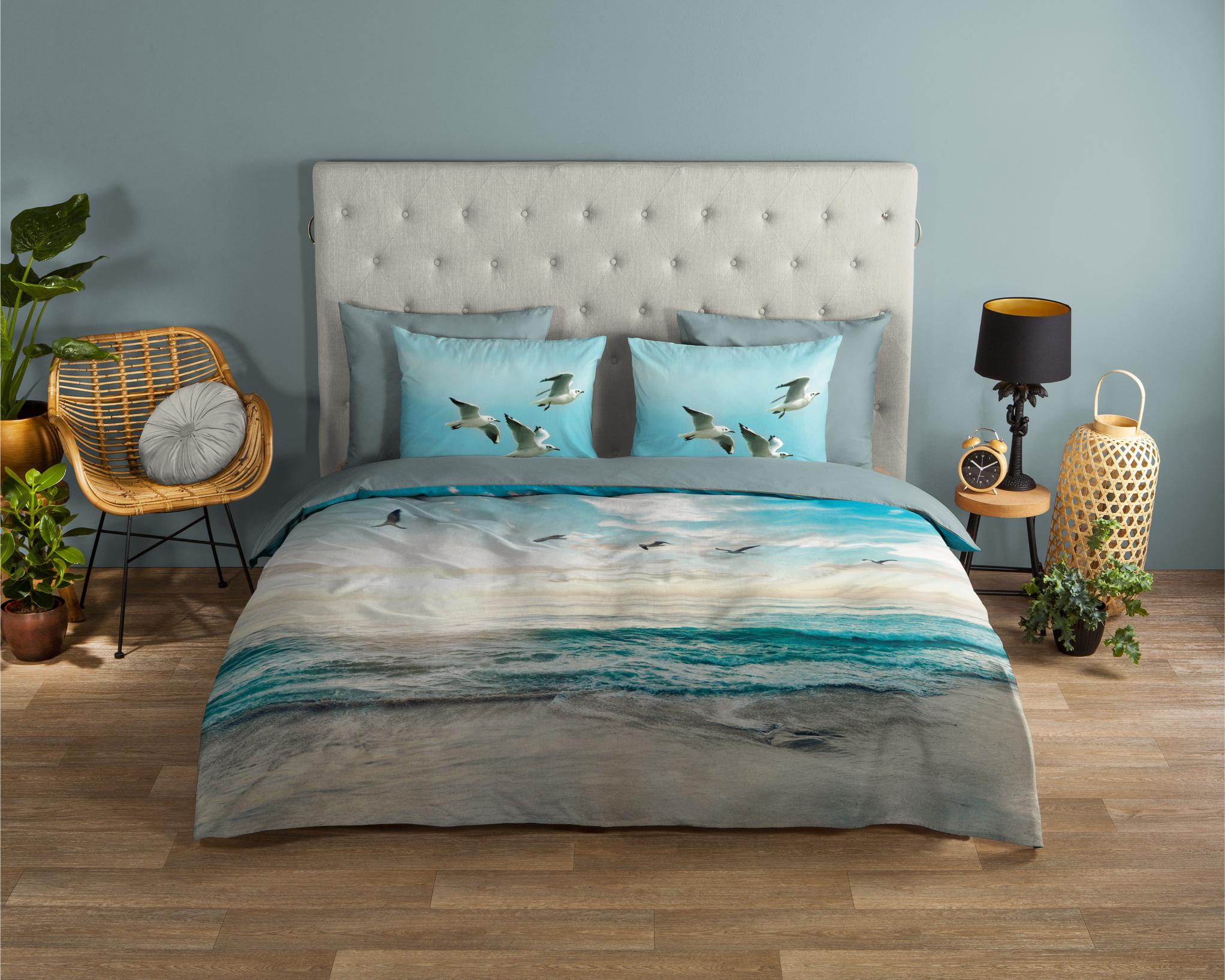 Housse de couette Brisa de Good Morning avec plage/mer, en couleur aqua. Elle est fabriquée en 100% coton. La qualité est respirante, absorbante et se sent douce et souple. Cette belle housse de couette égaye chaque chambre et convient à toutes les saisons. La housse de couette en coton est délicieusement fraîche en été et procure de la chaleur en hiver. L'ensemble se compose d'une housse de couette incluant une taie d'oreiller de 60x70 cm avec fermeture hôtelière. La housse de couette est dotée d'une double bande de boutonnage continue, ce qui la rend adaptée aux couettes d'une longueur de 200 à 220 cm. Cet article est certifié Oeko-Tex (Oeko-Tex Standard 100) : exempt de substances nocives et respectueux de la peau. Lavable à max. 40°C et adapté au sèche-linge.