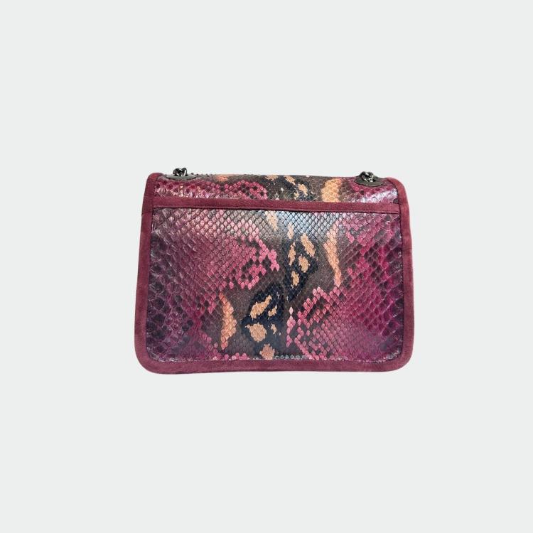 Sac en python, avec doublure intérieure en coton et anses en python et cuir. Un compartiment principal avec une petite poche et deux autres compartiments. Bandoulière métallique.