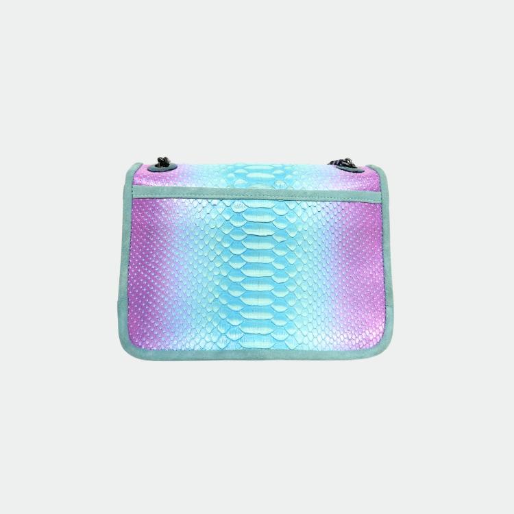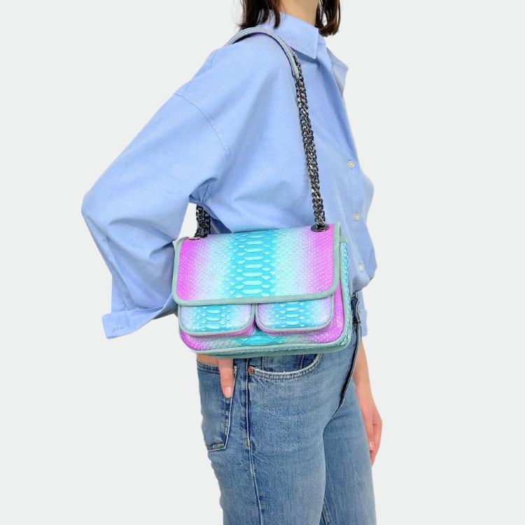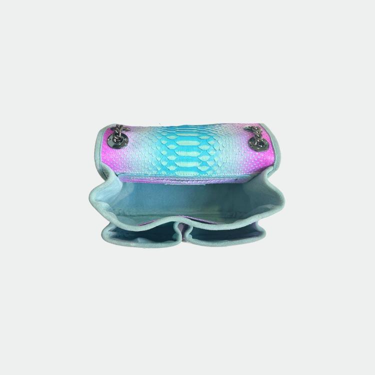 Sac en python, avec doublure intérieure en coton et anses en python et cuir. Un compartiment principal avec une petite poche et deux autres compartiments. Bandoulière métallique.