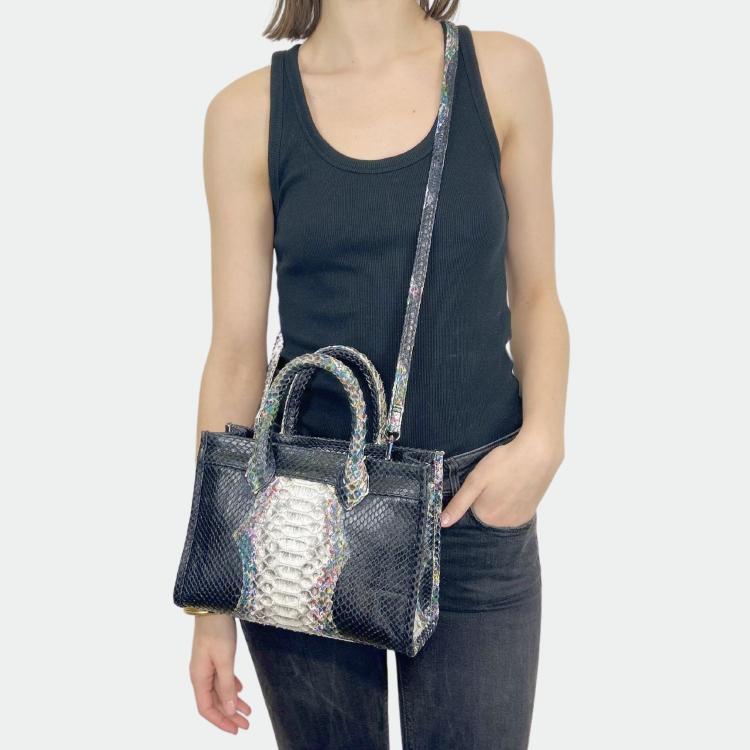 Tas in python, met binnenvoering vankatoen en stijve handvatten. Een hoofdvakmet een klein vakje en een vak met rits.Afneembare schouderriem in python.Afmetingen van de tas: 31 x 13,5 cm