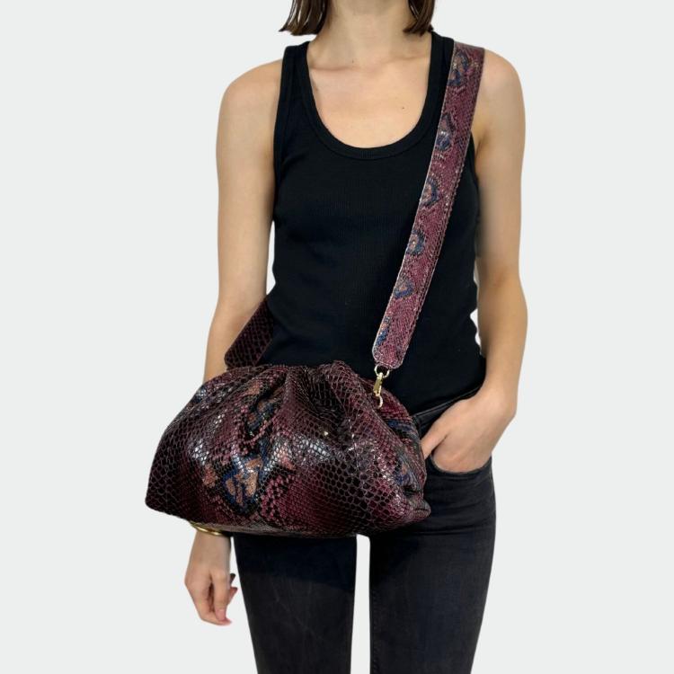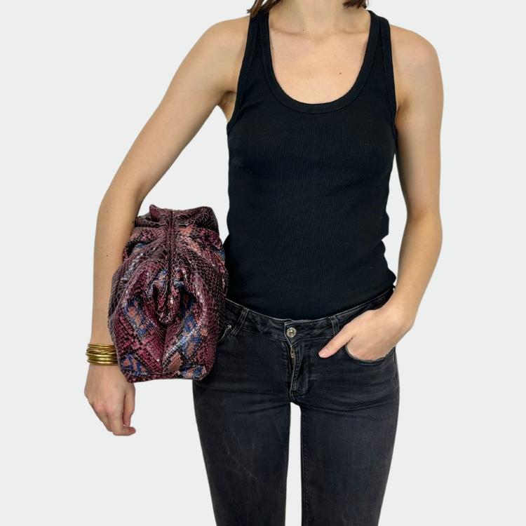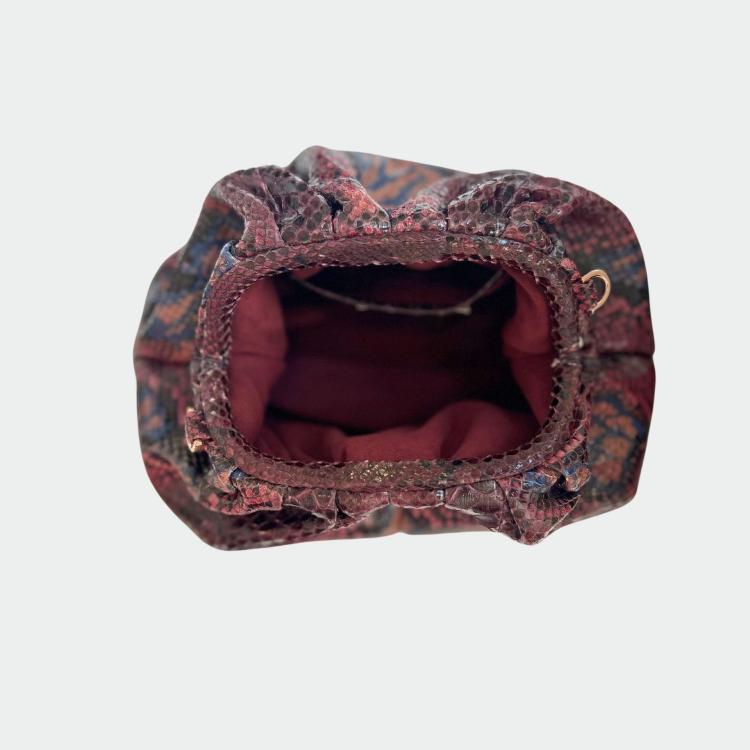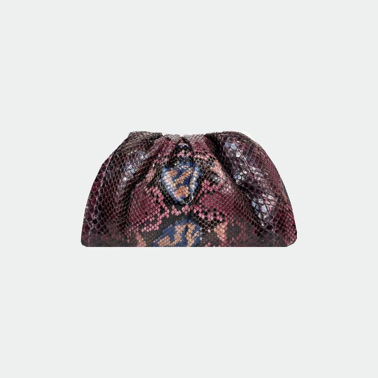 Zachte tas van python, met katoenen voering en magnetische sluiting. Enkel compartiment met klein zakje. Metalen afwerkingen. Afneembare schouderriem van python.
