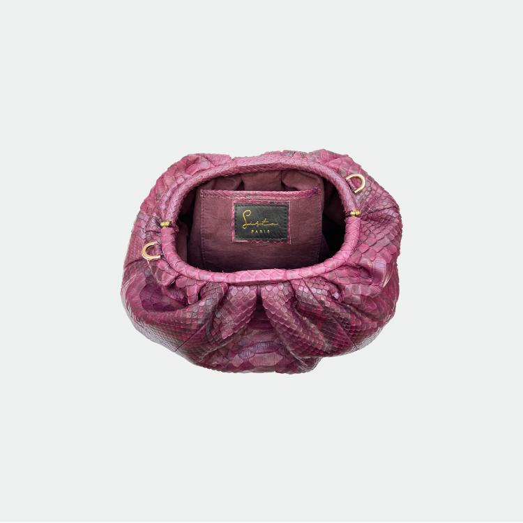 Zachte tas van python, met katoenen voering en magnetische sluiting. Enkel compartiment met klein zakje. Metalen afwerkingen. Afneembare schouderriem van python.