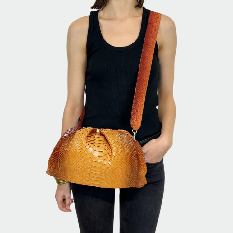 Zachte tas van python, met katoenen voering en magnetische sluiting. Enkel compartiment met klein zakje. Metalen afwerkingen. Afneembare schouderriem van python.