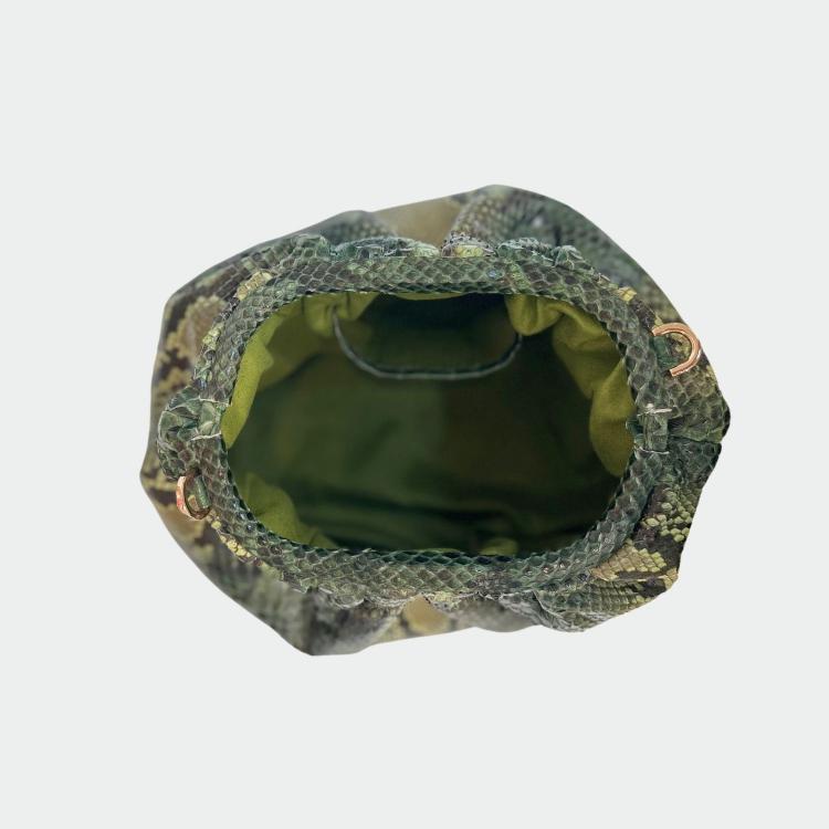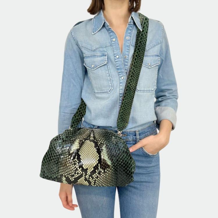 Zachte tas van python, met katoenen voering en magnetische sluiting. Enkel compartiment met klein zakje. Metalen afwerkingen. Afneembare schouderriem van python.