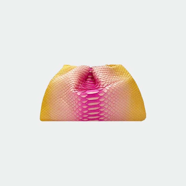 Zachte tas van python, met katoenen voering en magnetische sluiting. Enkel compartiment met klein zakje. Metalen afwerkingen. Afneembare schouderriem van python.