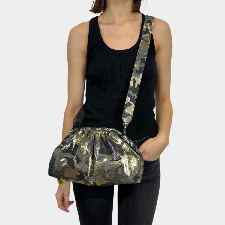 Zachte leren tas, met katoenen voering en magnetische sluiting. Enkel compartiment met klein zakje. Metalen afwerkingen. Afneembare leren schouderriem