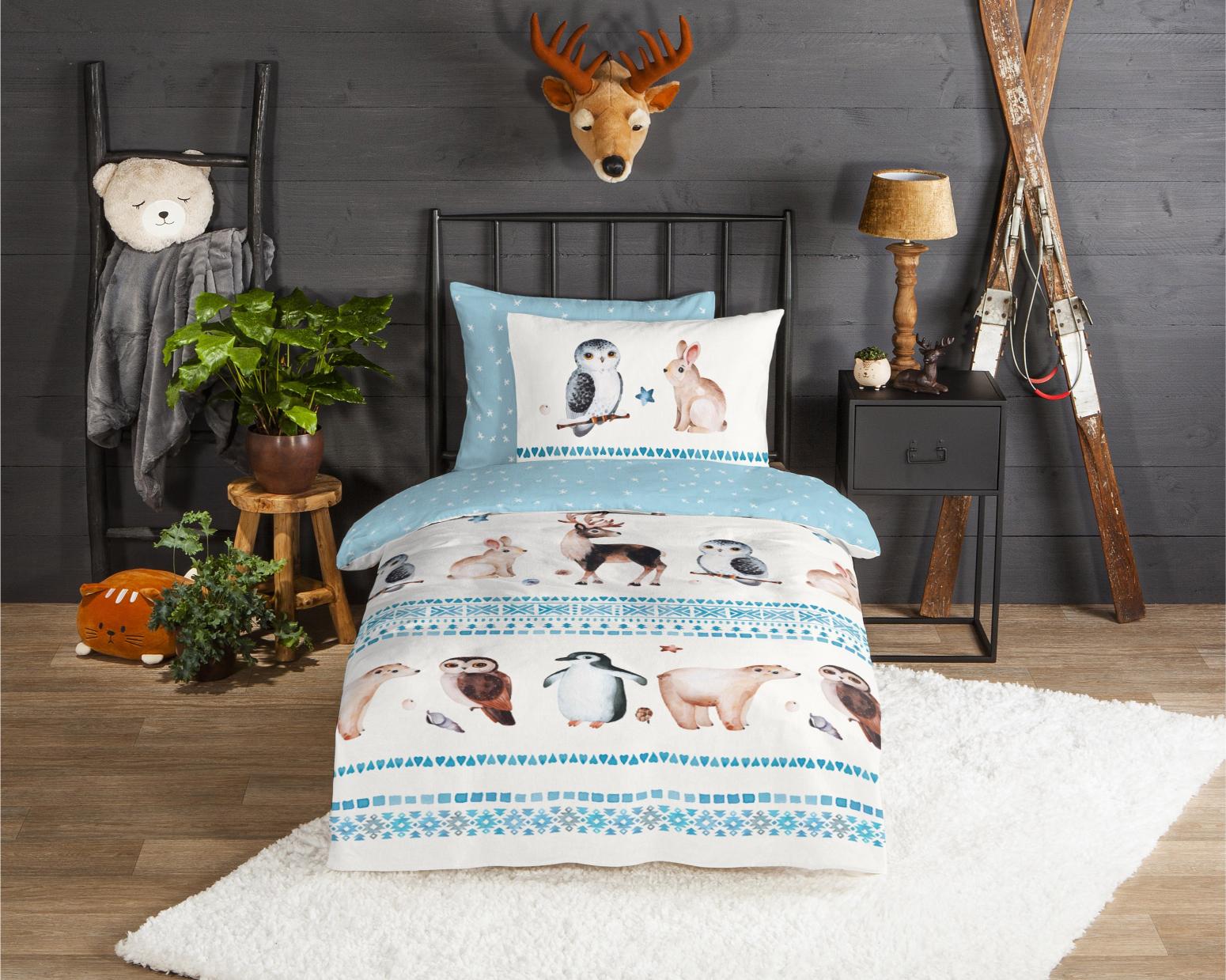 Flanellen kinderdekbedovertrek Freezing van Good Morning, in de kleur blauw, met een print van winterdieren. Het dekbedovertrek is gemaakt van 100% katoen/flanel dat licht is geruwd, waardoor een fluweelzacht laagje ontstaat dat heerlijk warm aanvoelt - perfect voor koude nachten. Deze warme, comfortabele stof is ademend en vochtabsorberend. Dit leuke kinderdekbedovertrek is een toevoeging aan iedere kinderkamer. Flanellen kinderdekbedovertrek zijn bij uitstek geschikt voor de koude wintermaanden.