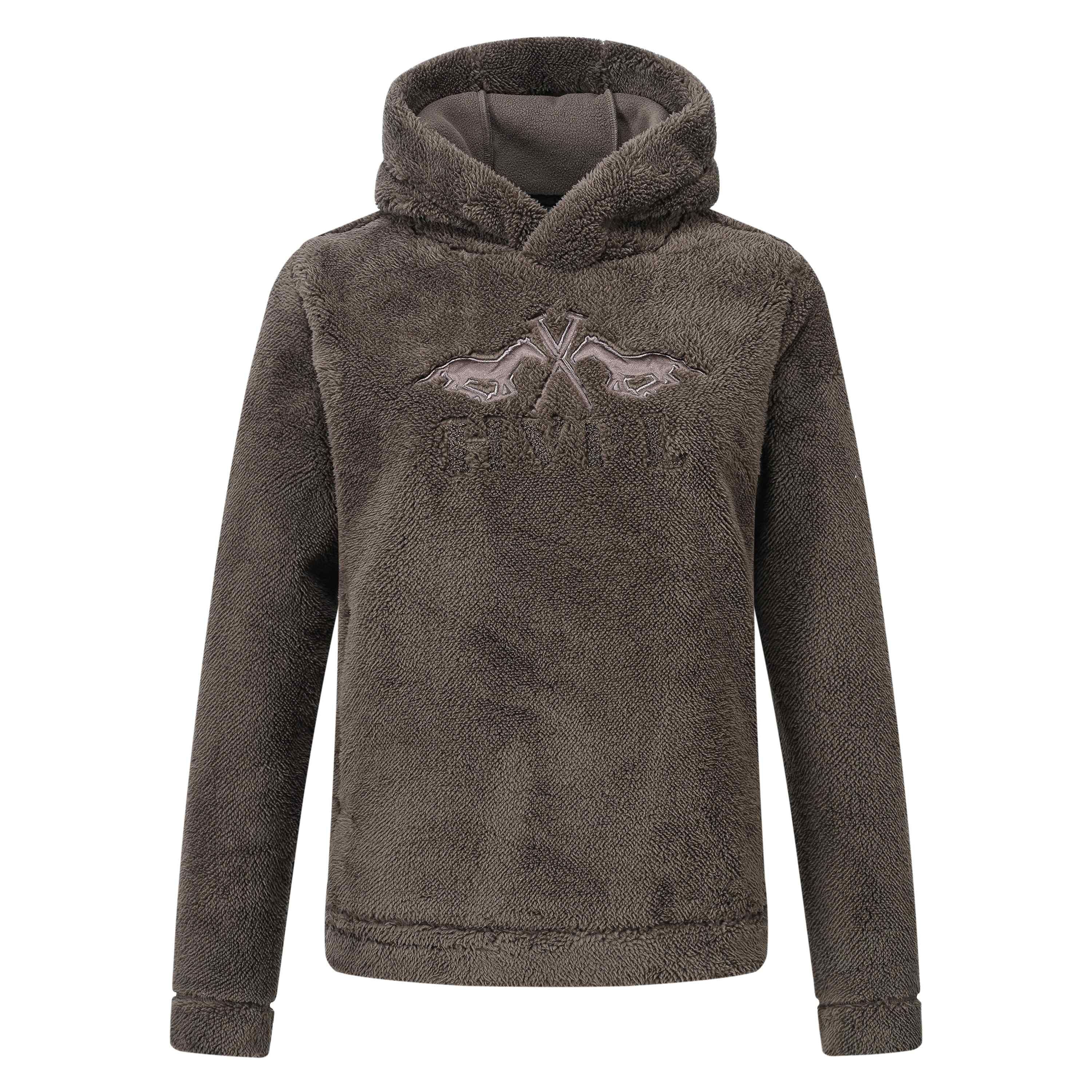 Comfortabele hoodie van lamsfleece * Vergrote paarden in applicatie op de voorkant van de borst * HVPL in badstofborduursel onder de paarden * Zakjes aan de voorkant * Decoratieve overlocksteek op de naden * Metalen munt aan de onderkant, links van de drager