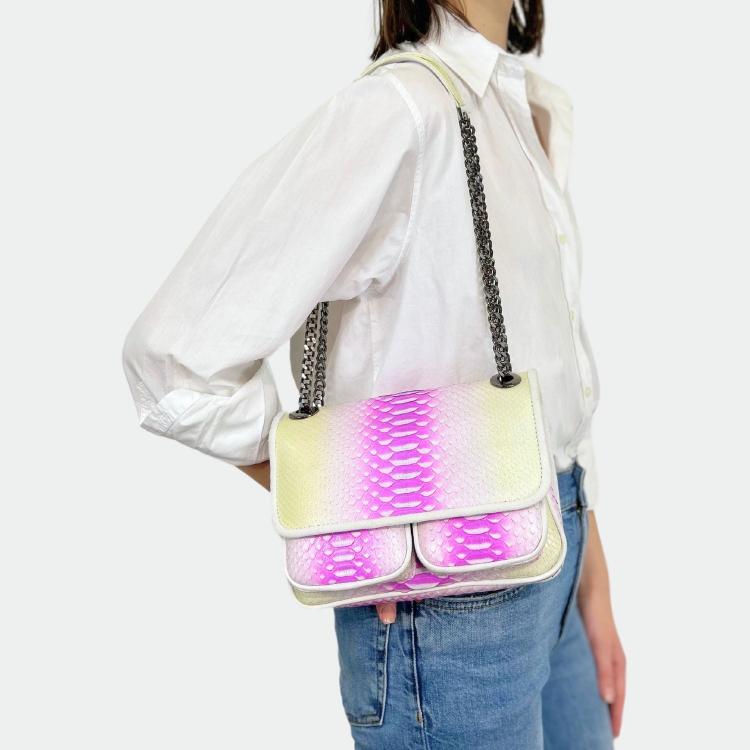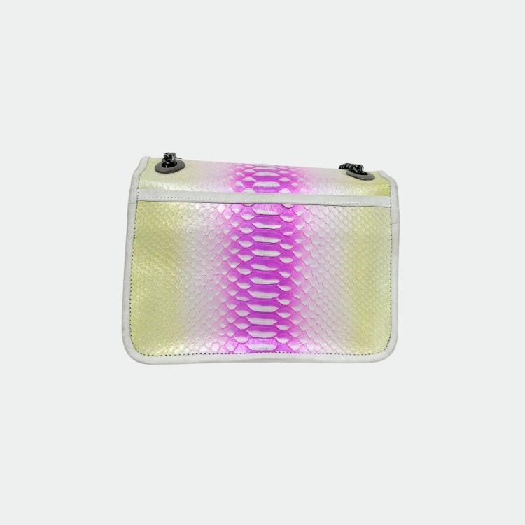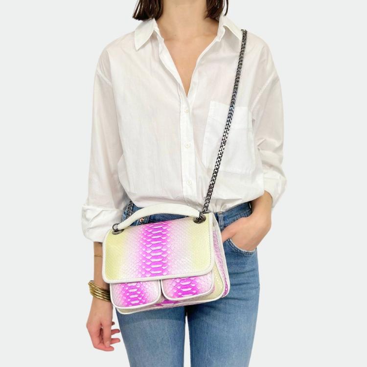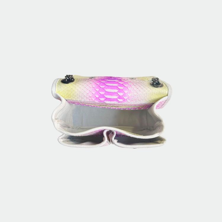 Tas in python, met katoenen voering en handvatten in python en leer. Een hoofdvak met een klein zakje en twee andere compartimenten. Metalen schouderriem.