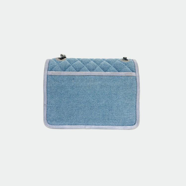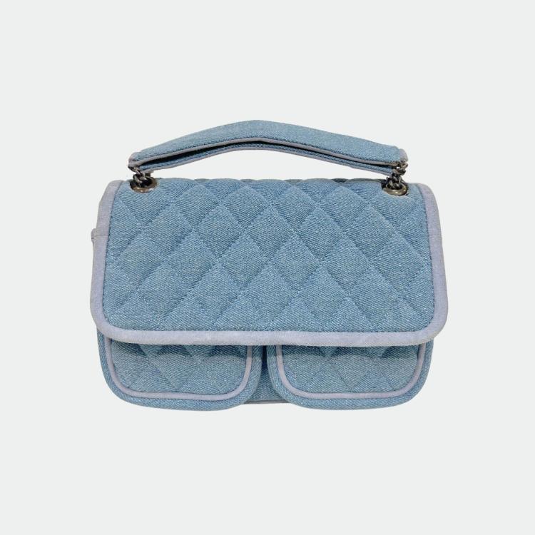 Denim tas, met katoenen voering en handvatten van denim en leer.