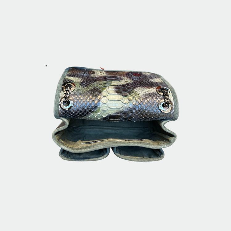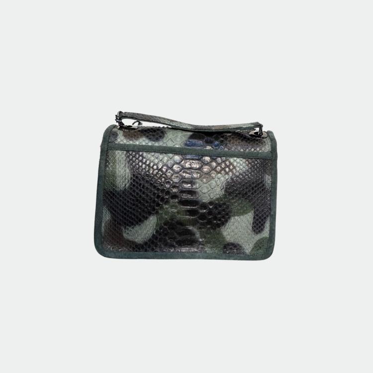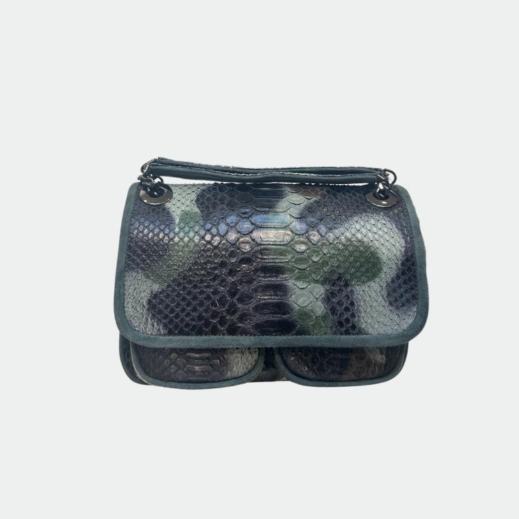 Tas in python, met katoenen voering en handvatten in python en leer. Een hoofdvak met een klein zakje en twee andere compartimenten. Metalen schouderriem.