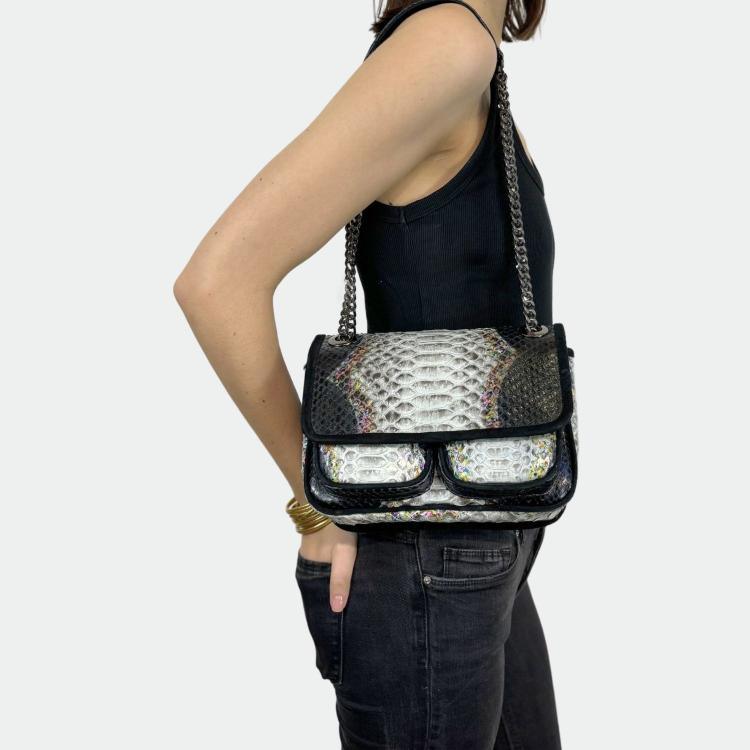 Tas in python, met katoenen voering en handvatten in python en leer. Een hoofdvak met een klein zakje en twee andere compartimenten. Metalen schouderriem.
